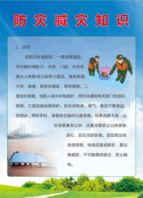 受到洪水威脅時(shí),一是轉(zhuǎn)移避險(xiǎn)。盡可能利用船只、木排、門板、木床等,做水上轉(zhuǎn)移;或立即爬上屋頂、樓房高屋、大樹、高墻,做暫時(shí)避險(xiǎn),等待援教。二是組織救援。當(dāng)有人被洪水包圍時(shí),想辦法通知有關(guān)部門和組織救援。三是加強(qiáng)自我保護(hù)。如關(guān)閉電源、煤氣、備足干糧食品、飲用水,帶好手機(jī),準(zhǔn)備救生器材以備急需。如果連降大雨,山區(qū)容易暴發(fā)山洪,還要注意防止山體滑坡、滾石、泥石流的傷害。發(fā)現(xiàn)高壓線鐵塔傾倒、電線低垂或斷折,要遠(yuǎn)離避險(xiǎn),不可觸摸或接近,防止觸電。
